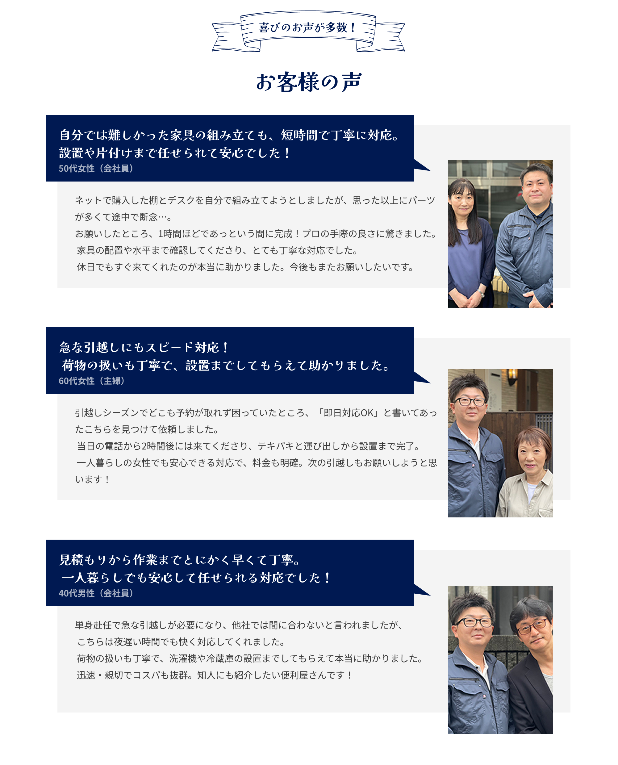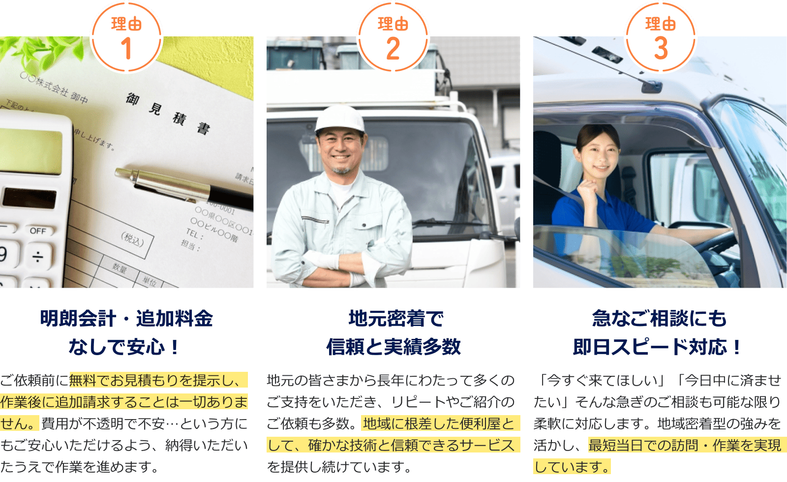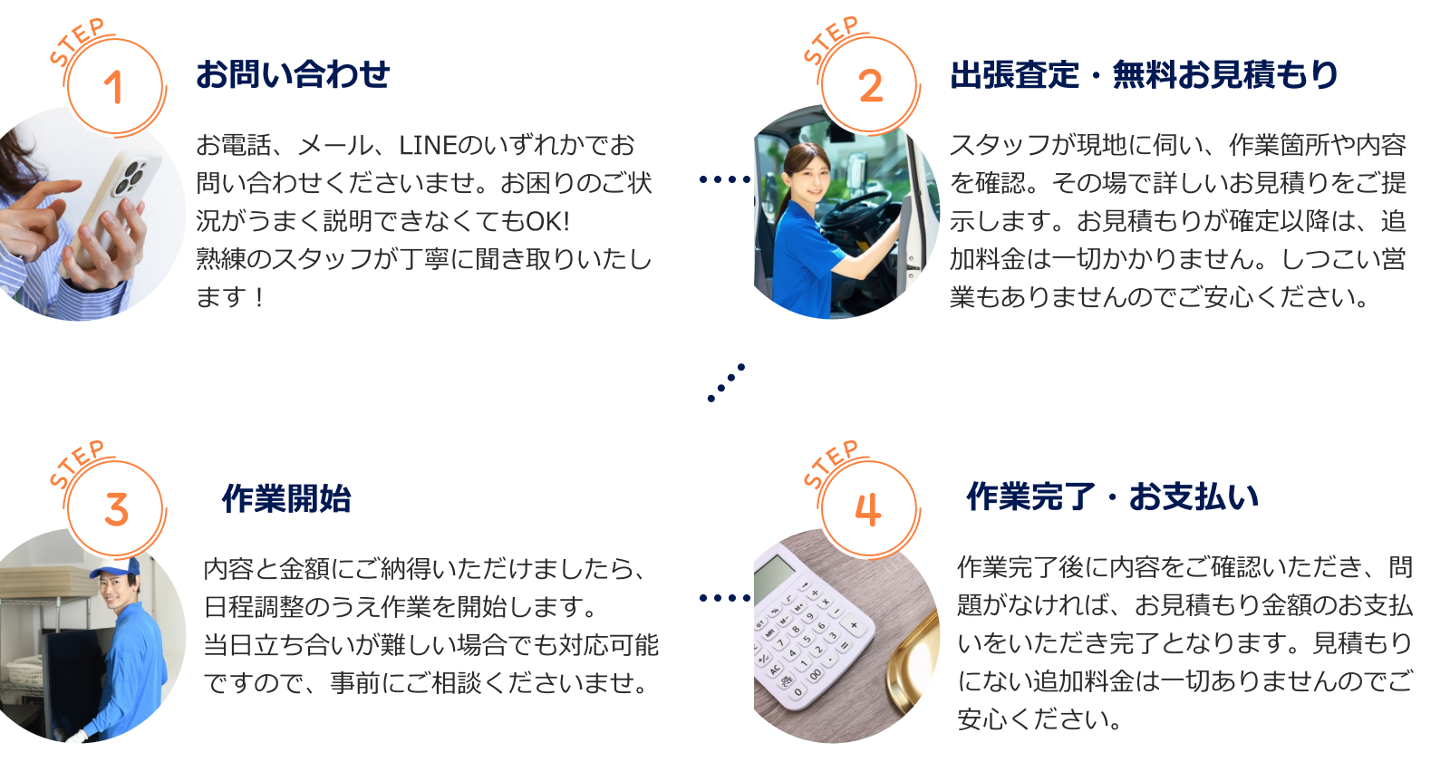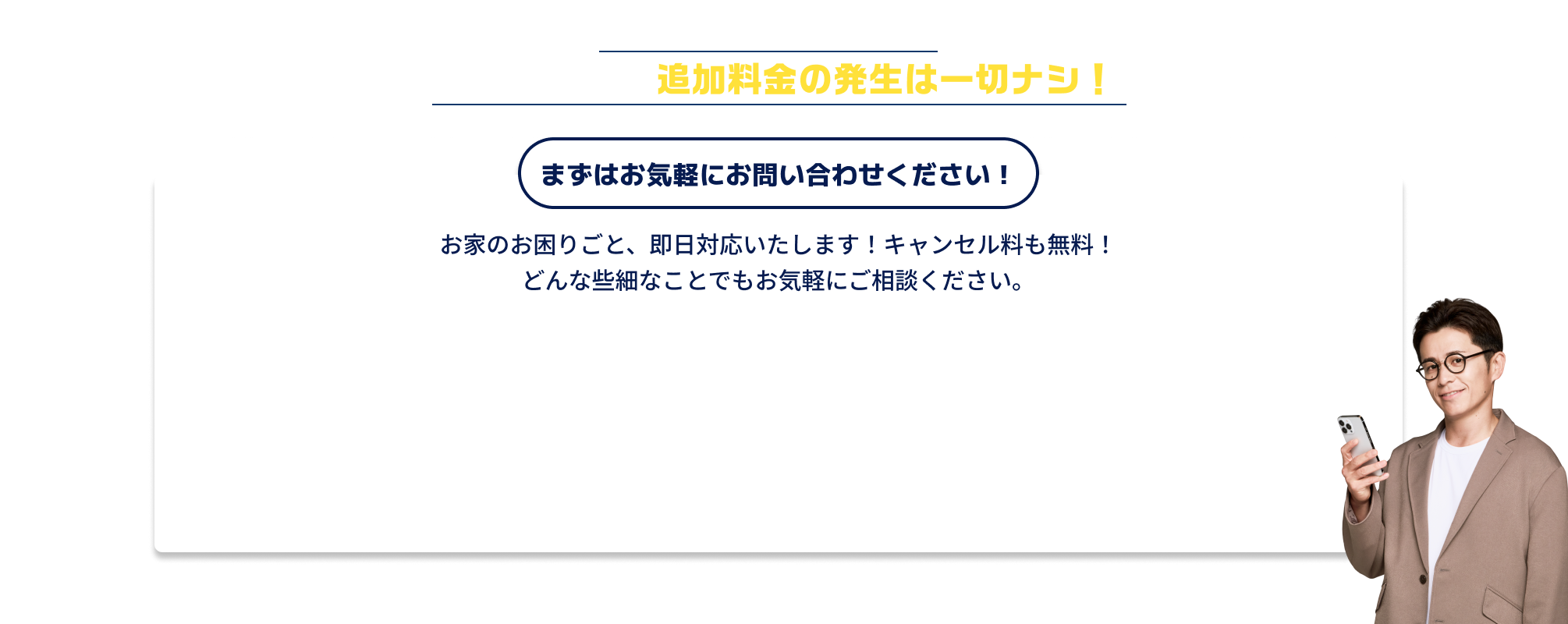 - もちろんです。弊社は事前にお見積もりを行っており、お見積もり確定後の追加料金などは一切いただきません。出張お見積もりの費用なども一切かかりませんのでご安心くださいませ。