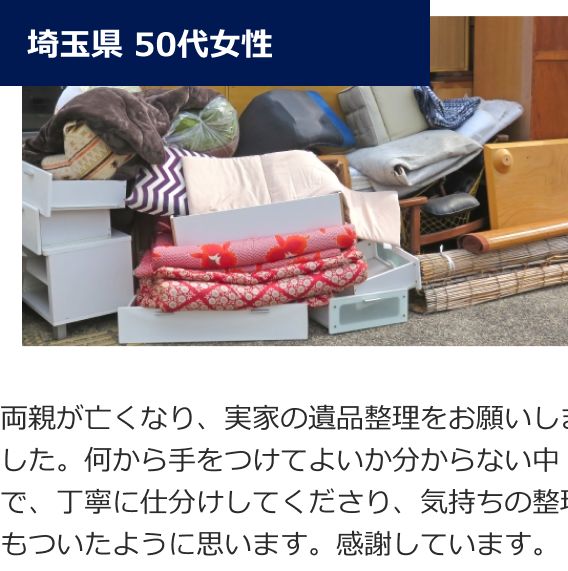 - お仏壇などの仏具、神棚や眼鏡、腕時計、ご結婚指輪など、故人様のご愛用品の処分については、ご希望の場合、提携寺院にて丁寧にご供養させていただきます。ご供養についての追加費用は一切頂戴しておりませんので、ご安心くださいませ。